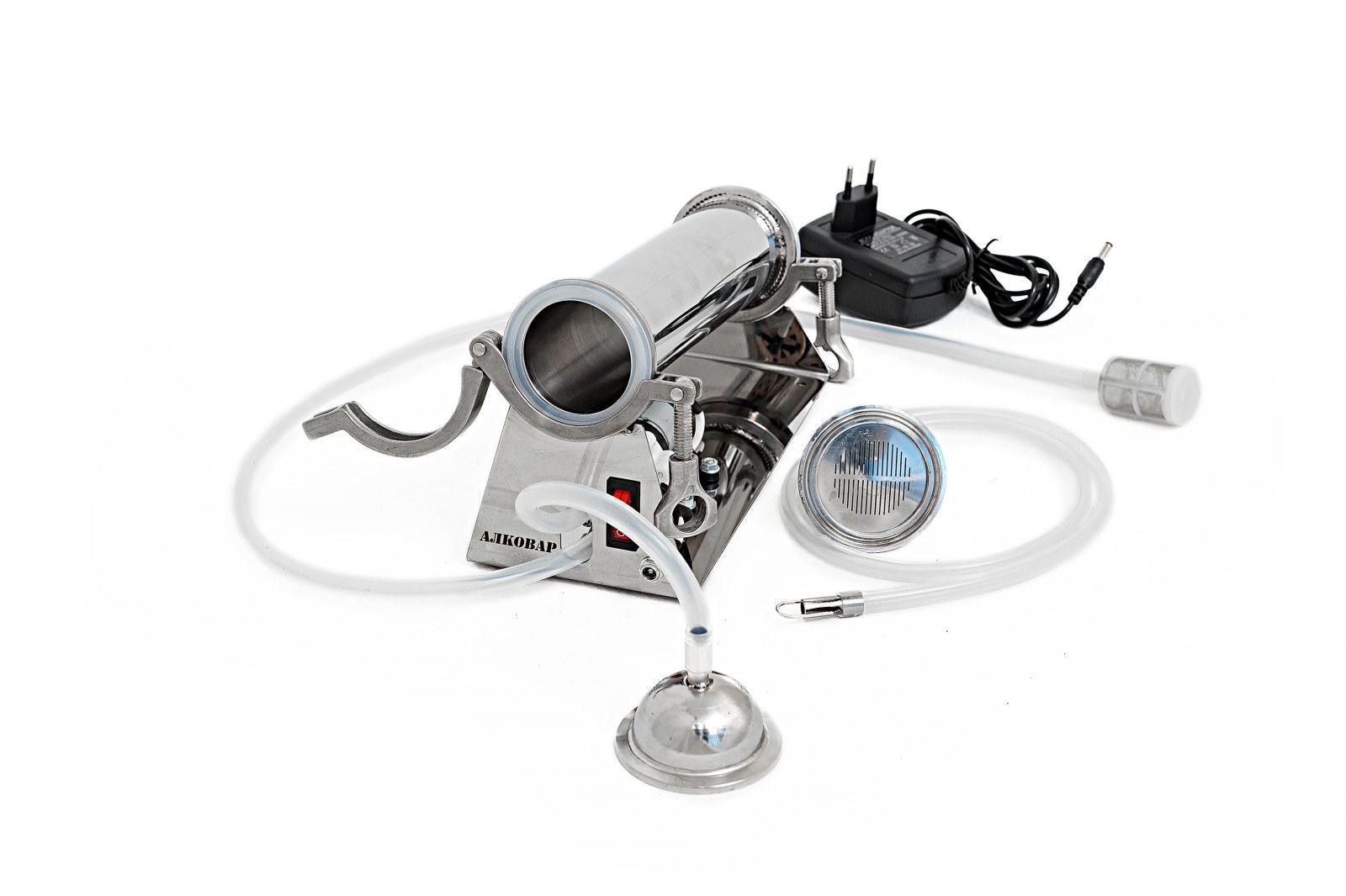 Использовать фильтр очень просто: Картридж устройства заполняется кокосовым углем. Готовый дистиллят заливаем в какую-нибудь емкость. Опускаете в емкость оба шланга и включаете насос. Продукт начинает циркулировать через фильтрующее устройство, очищаясь и смягчаясь.